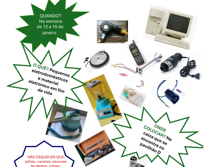 Recolha de Pequenos Resíduos Elétricos e Eletrónicos By: On: In: Destaques 12 a 16 de Janeiro Ver mais